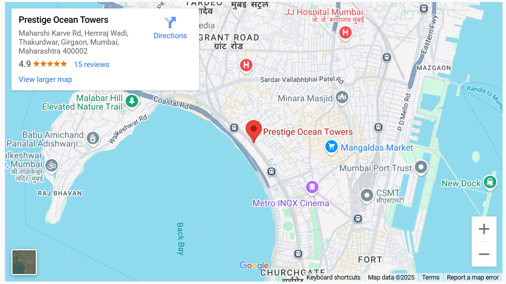 Pristige Ocean Towers - Explore an undiscovered lifestyle next to Queen's Necklace of Mumbai - Marine Lines. With the lavish 4 & 5 BHK villament & Jodi homes, every second you get to experience the boundless beauty of the Arabian Sea through the grand deck. A multi-storied indoor podium presents global standard amenities such as - a clubhouse, infinity edge pool, fully equipped gym, multi-sports court, indoor games & many more. Posh living with the absolute conveniences next to your home adds on to your lifestyle. For that - Wilson High School, Sir HN Reliance Hospital, Phoenix Palladium, Metro INOX Cinema, Reliance Smart Superstore, Priyadarshini Park, etc are at easy reach. World gets closer to you in just a short drive to Eastern Express Highway, Bandra Worli Sea Link Flyover, Eastern Freeway, Atal Setu Bridge, Marine Lines Railway Station & CSM International Airport. So, an incomparable lifestyle is awaited for you at Marine Lines - Prestige Ocean Towers!
